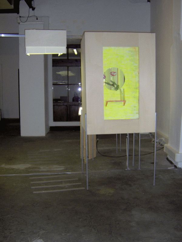 Ist das eine Straßenszene hinter einem Lamellenvorhang hinter einer Blume, vor einem Spiegel, an einer Wand? Der Betrachter wird vor Fragen gestellt, die er nicht nur optisch, sondern durch eigene Bewegung und Reflexion lösen kann.