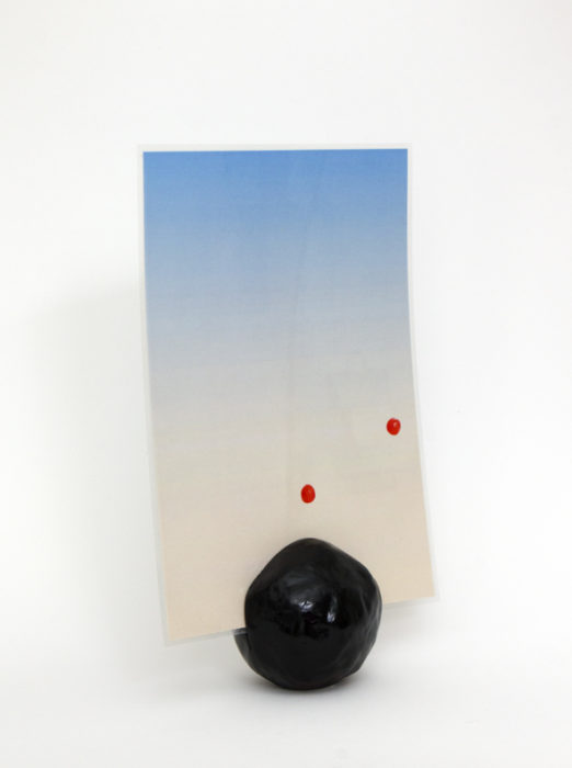 Keramik ungebrannt, Autolack, C-Print laminiert (zweiseitig: eine Seite hier sichtbar, die andere wie die Einladungskarte unter Ausstellung Hella Gerlach zu sehen)