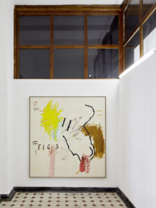 Der Prozess aus Aktion und Revision, aus einem ganz physischen Addieren und Subtrahieren, ist wesentlicher Bestandteil ihrer Malerei. Auf ein Herantasten und Andocken an die Leinwand mit Fingern, Pinsel oder Spraydose folgt ein dekonstruierendes Weiterentwickeln. Mit einem überzeugten „Ja“ zum absichtlichen, und trotzdem auch spielerischen, Pentimenti werden, im künstlerischen Ringen mit Linien, Formen und Farbflächen, einzelne Partien immer wieder annulliert – durch Abduschen, Wegwischen, Übermalen oder demonstratives Durchstreichen von Text- oder Bildelementen.