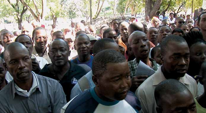 She examines the question of the extent to which collective experiences and memories of their formative period in the former GDR, but also mechanisms of delimitation from Mozambican society after their return, have shaped a “group identity“. The film begins by presenting some of the protagonists, including Azeitonas, Frio, Nelson, and others, and shows them at the place of their weekly meeting of the “Base Central“ in the Jardim dos Madgermanes in Maputo, where they prepare for their demonstrations (“marcha“). This is staged through powerful images in the middle of the piece. The last part is devoted to the work of the study, and, once again, gives the affected persons the opportunity to speak: “When people see us as we protest, they call us Madgermanes. Why? Because we belong to the group of returnees from the GDR.“ (Azeitonas, 2012)