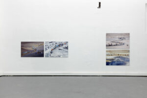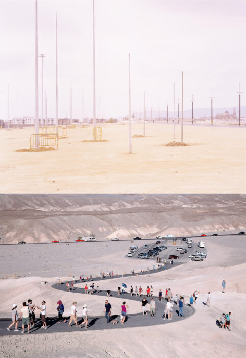 In his photographic works, Rainer Zerback (*1958) has been intensively concerned with the theme of civilisation for over thirty years. The title of his solo show RECENT TOPOGRAPHICS refers to the American landscape photography of the “New Topographics”, which emerged in the 1960s and consciously turned against the traditional romanticising landscape photography of the 19th and early 20th centuries. It focused on landscapes that, due to their banality, had not received any photographic attention until then, such as agricultural landscapes, suburban settlements or industrial plants. In contrast, Rainer Zerback’s exhibition RECENT TOPOGRAPHICS once again focuses on the beautiful or even spectacular landscape that is worth seeing. However, these natural landscapes are not untouched by human civilisation, be it through relics of man – sometimes only recognisable at second glance – or through the massive presence of man himself.