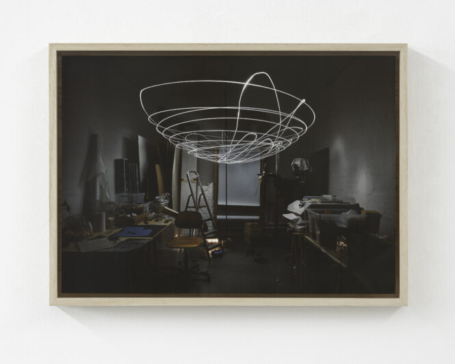 Bewegungsverlauf, eines eingeschalteten, hängenden mit LED bestückten PC-Lüfters in meinem Atelier